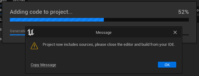 5. 以下の Messagega表示されたらOKをクリックしUE editorをクローズ後、プロジェクト内にできた*.slnをダブルクリックしVisual Studio 2019を起動する。